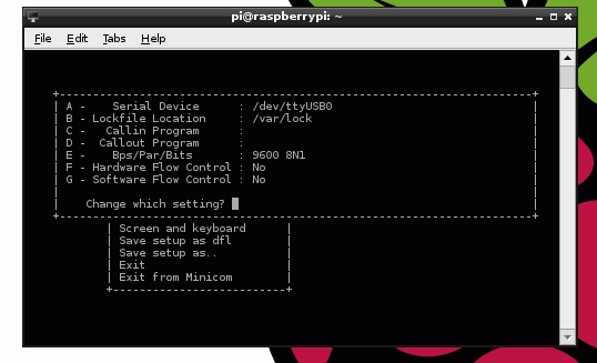 5. Select Serial Device by pressing "A" and set to /dev/ttyUSB0. Then type Enter.